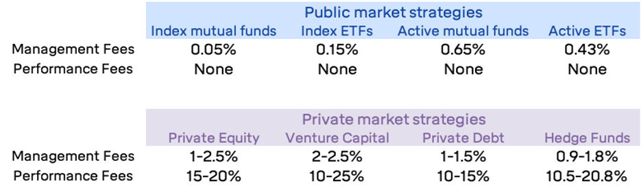 Note: Public market strategy fees are based on the asset-weighted average for 2023, compiled using Morningstar data. Private market fees are presented as ranges from various fee surveys performed by institutional investors.