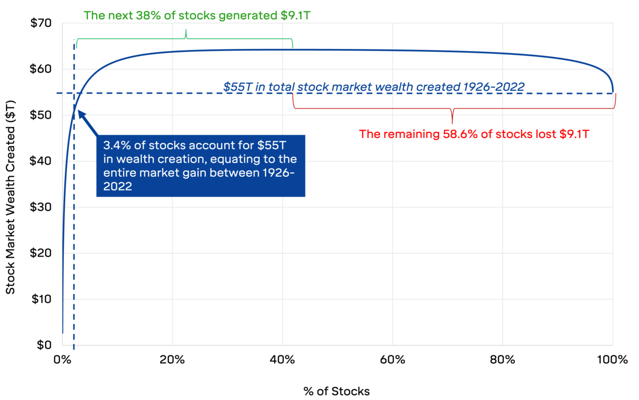 The below chart shows that a mere 3.4% of stocks have generated 100% of the $55T (with a T!) in aggregate wealth creation in the U.S during the period 1926-2022. The remaining 96.6% of stocks have all had varying successes but cumulatively have created zero net value for investors.