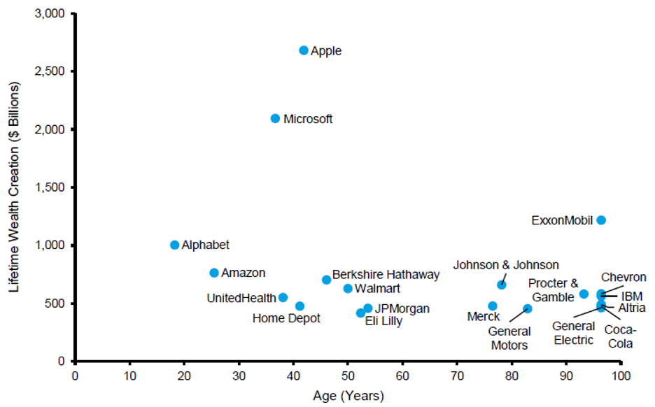For those wanting a reveal of these tremendous compounders, the following chart from Morgan Stanley shows the total wealth created by the top 20 stocks and their age (measured in years as a public company).