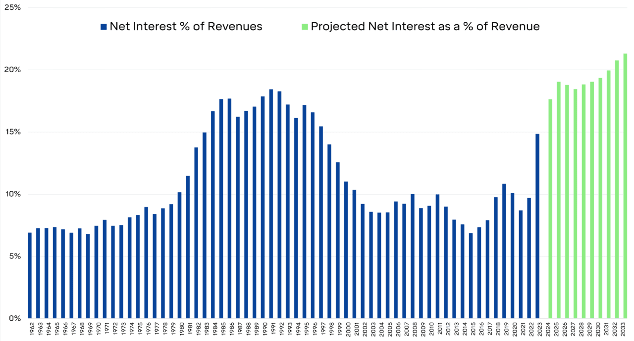 Issuing debt at these higher rates will cause the amount of interest the US Government pays to balloon. Below is a chart showing the actual and projected interest expense as a percentage of revenues for the U.S. government. You can see that interest payments will jump to a level not seen since the 1970s — what was less than 10 cents of every dollar going to service interest will double in the coming decade.