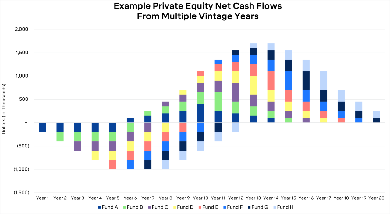The details of how to model private investment calls and distributions are beyond the scope of this article. However, Burgiss, a private investment data and analytics company, provides helpful guidance and insight on cash flow modeling in its paper, Modeling Cash Flows for Private Capital Funds. Further, some private investment data firms, such as Pitchbook, have tools that assist investors in commitment pacing and cash flow modeling.