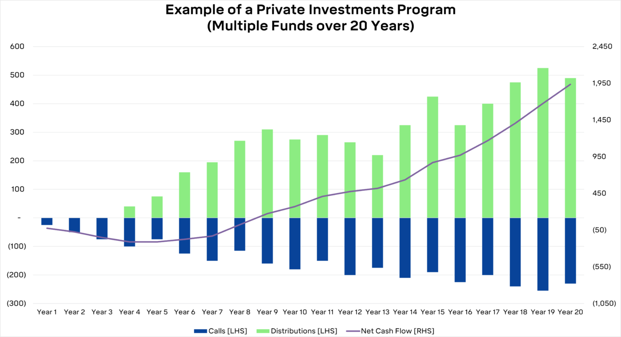 Eventually, a private investment program becomes largely self-funding as distributions from older funds are sufficient to cover the capital calls from newer funds. The below chart shows the capital calls and distributions for a hypothetical multi-fund multi-vintage year program over its first 20 years.