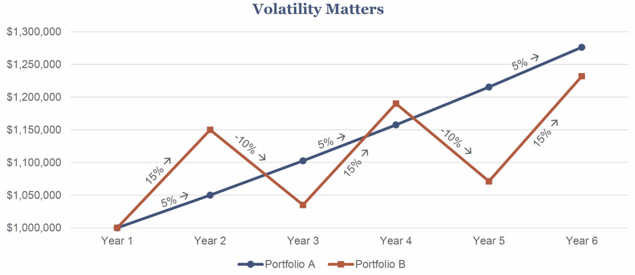 Creating an investment portfolio that reduces volatility is beneficial from both return and psychological perspectives. Wait – how does reducing a portfolio’s volatility increase its overall return? Interestingly, a smooth stream of returns will produce more dollars over time than a volatile stream of returns with the same average arithmetic return. The math is demonstrated on the chart below – two $1 million portfolios averaged a 5% annualized return over five years, but the volatility experienced in Portfolio B reduced its five-year total return by over $40,000 in comparison to Portfolio A.