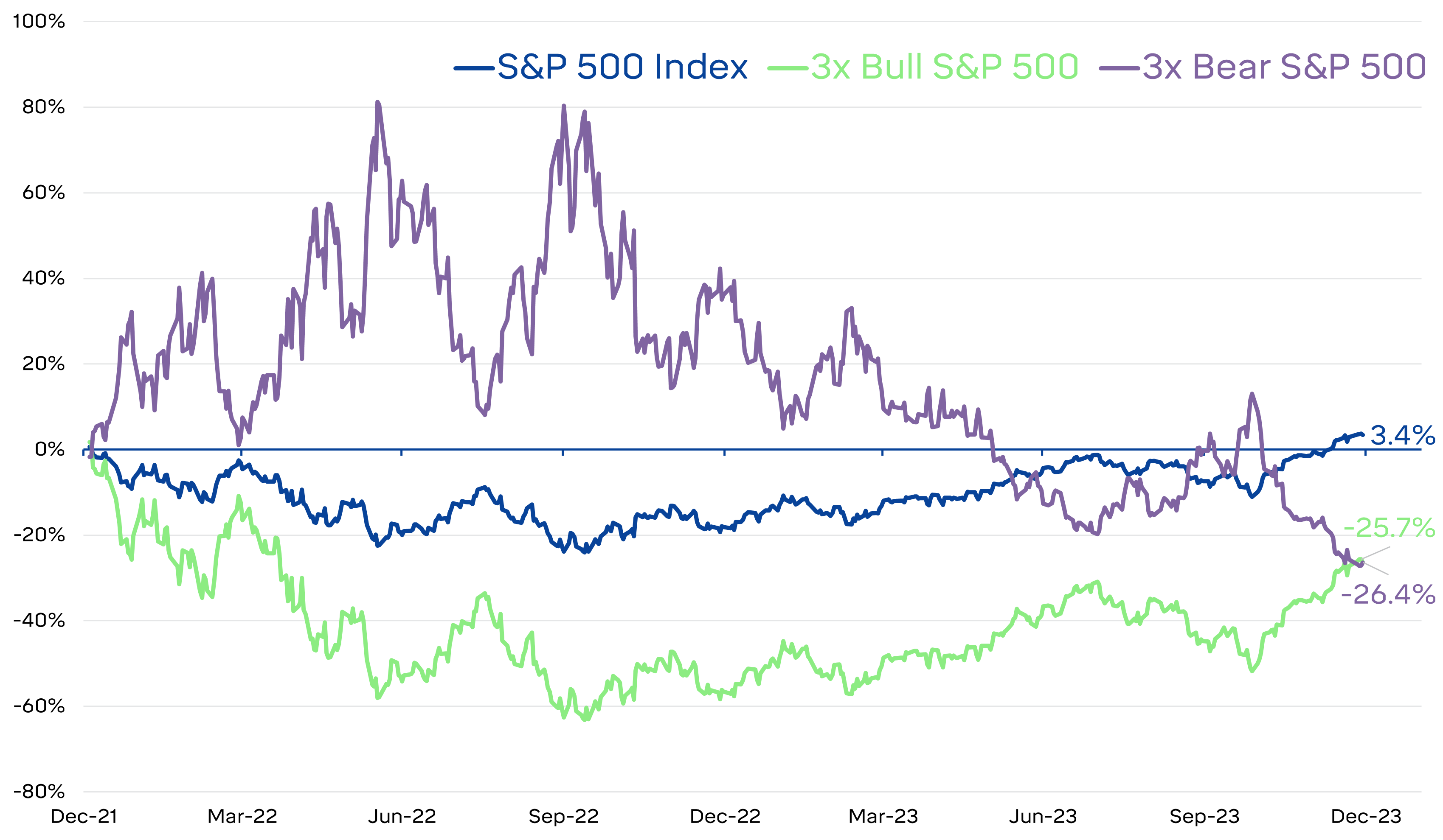 Over the past two years, investing in the S&P 500 Index has been a wild ride. 2022 saw inflation fears, rising rates, and concerns of an imminent recession. The market dropped 18% that year before rebounding 26% in 2023 on the back of economic resilience and big tech enthusiasm. Over that two-year window, the S&P 500 achieved a 3.4% total return. One would think that over that period, a 3x leveraged S&P 500 ETF return would be 10.2% (or 3.4% times 3), and the 3x inverse leveraged S&P 500 ETF would return -10.2% (3.4% times 3). But one would be wrong.