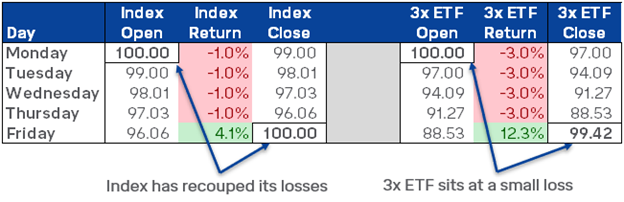 This erosion of returns occurs with each daily reset, and when a fund is leveraged, that erosion is magnified. Larger losses need even larger gains to get back to even. The 3x ETF needed a 13% gain on Friday to break even but only got 12.3%, leaving it at a loss. If you compound these differences over time, the deviation gets wider.