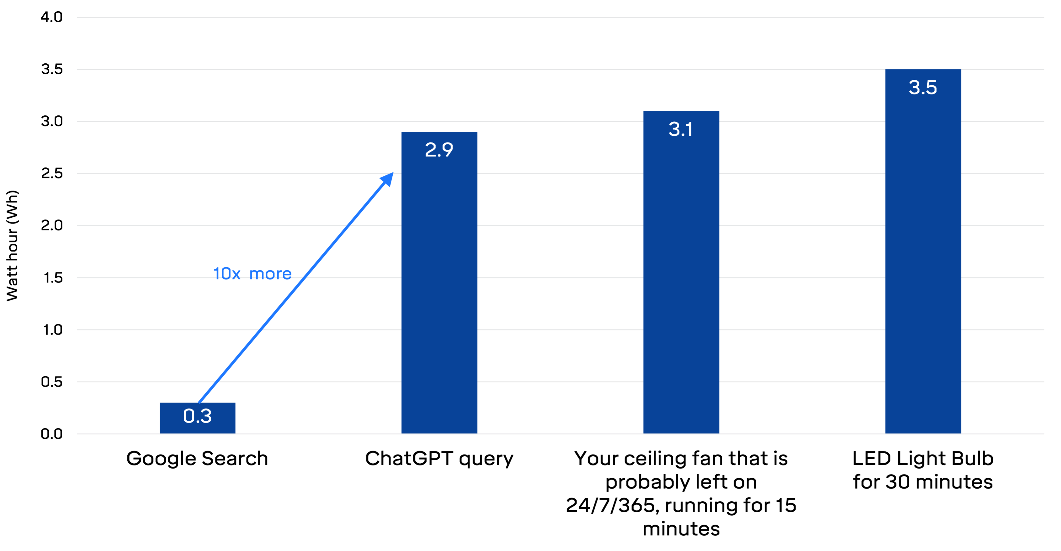 One fun stat that introduces us to the potential power needs deals with the adoption of ChatGPT. A ChatGPT query requires about 10X more electricity than a traditional Google search (2.9-watt hours vs. 0.3-watt hours). Next time you ask ChatGPT to help plan a vacation itinerary, know it’s using a similar amount of power to your ceiling fan running for 15 minutes (that, if you’re like me, you never turn off for the entire year)