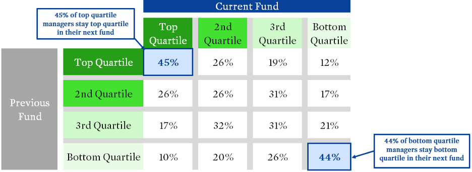 The results are hot indeed – 45% of top quartile managers remained top quartile in their subsequent fund. This outcome is better than pure chance, which would result in 25% odds of each quartile. And top quartile funds were in the top half 71% of the time (e.g., 45% + 26%). Similarly, the bottom quartile performers remained in the bottom quartile for their next fund 44% of the time, again greater than the 25% odds that chance would dictate.