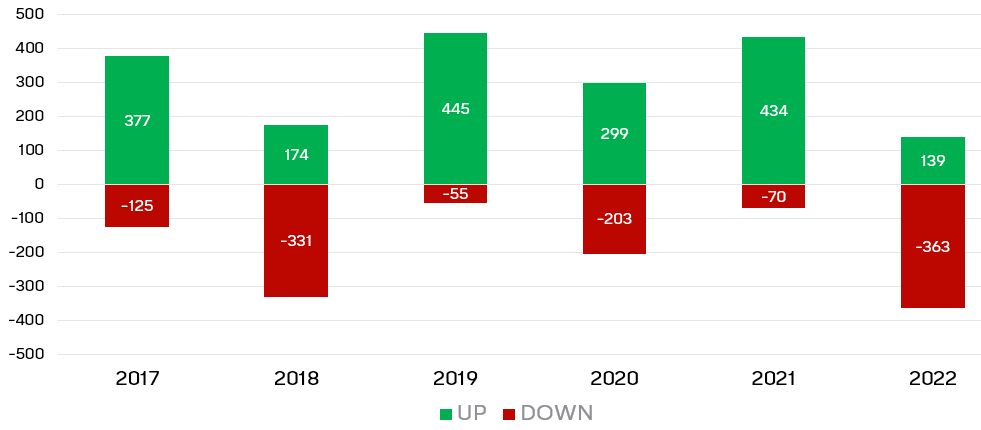 Number of S&P 500 stocks that are up or down in a given calendar year (2017—2022)