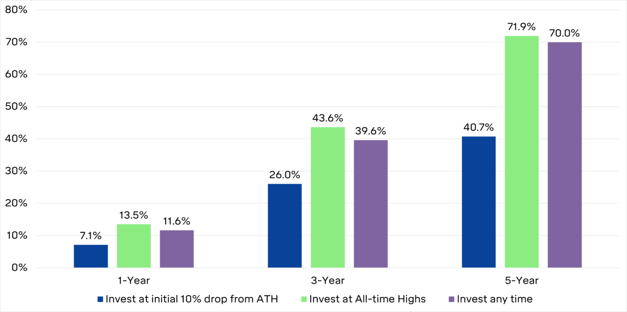But the dot-com bubble’s collapse is just one data point. Looking at the data more broadly, we find that investing at all-time highs works out well. The chart below shows three investment timing scenarios: (1) waiting for a 10% pullback from all-time highs to invest (being cautious), (2) investing at the all-time highs (embracing it), or (3) investing on any given day (ignoring all-time highs).