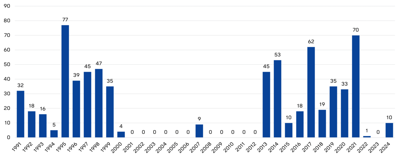 Why is this? The chart below shows the yearly occurrence of all-time highs in the S&P 500 Index from 1991. All-time highs in the S&P 500 Index have tended to cluster around periods of sustained economic growth and bull markets. Waiting for stocks to go on sale, so to speak, could leave investors sitting out of the market for a considerable time.