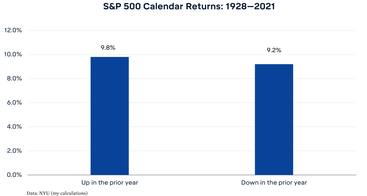 Similarly, an analysis by Ben Carlson of stock returns between 1928 and 2021 found that on average the stock market is up about an equivalent amount following both up and down years. He found that the average return following an up year was 9.8% and 9.2% after a down year.