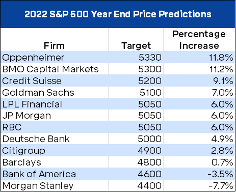A year ago, the Wall Street consensus was that the S&P 500 would reach 4,825, a modest increase of about 2%, far off the nearly 20% decline we experienced in 2022. Specifically, here are the 2022 predictions of some of the biggest investment firms: