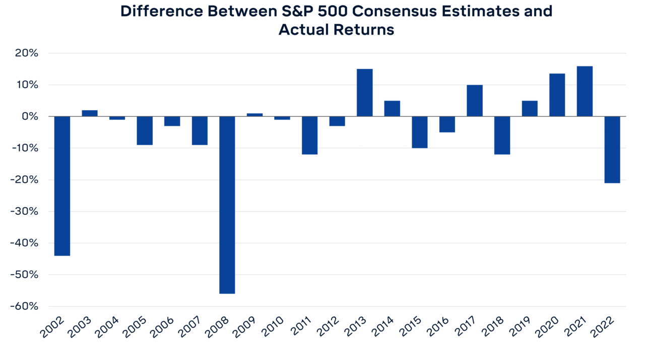 As the above table shows, none of the firms’ predictions were remotely close. And they are consistent with the poor track record of expert predictions in other years. The wrongheaded predictions of 2022 were not outliers; 2022 was not exceptional; market predictions are always toss-ups. Don’t believe me? The below figure shows how far off the consensus S&P 500 prediction was from the actual return by year.
