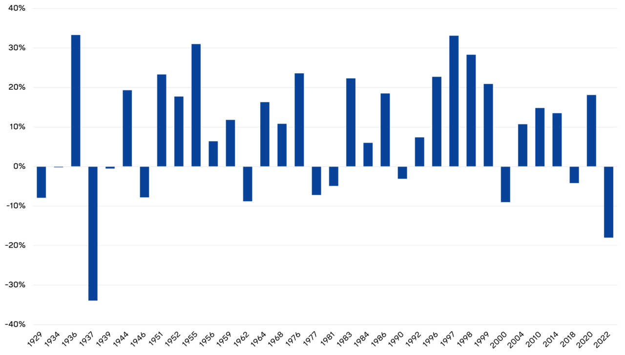 Between 1928 and 2022, the S&P 500 has delivered a return of more than 20% 34 times. The market delivered positive returns the following year 22 times (65% – see chart below).